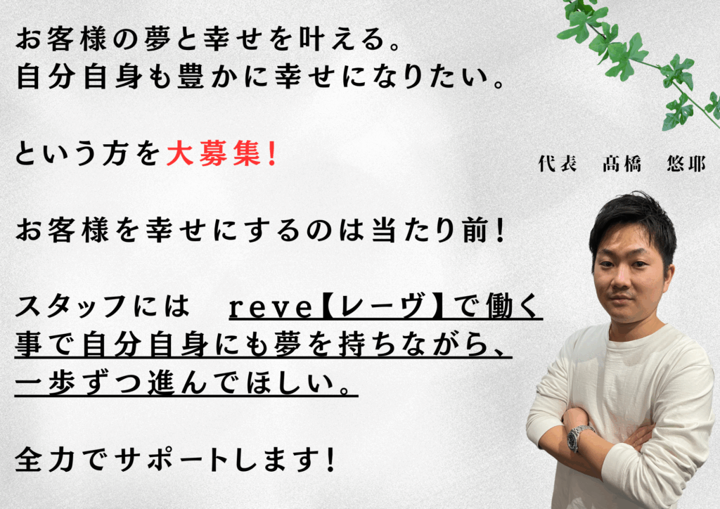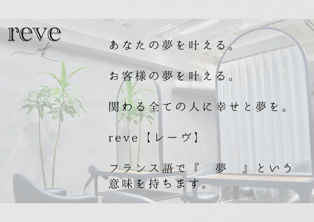 | 道案内 | JR吹田駅東改札を出て左側北口に歩きます。左手にアサヒビール工場の横の道を真っ直ぐ進みます。信号機のある交差点を斜めに渡って頂くと、ふくちゃん餃子とラーメン屋さんの横のビルの階段を 2Fに上がって頂きましたら、reve【レーヴ】があります。 |
